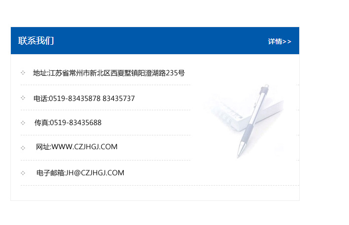 傳真:0519-83435688    郵編:213135    網址:WWW.czjhgj_com.gzzsit.com    電子郵箱:JH@czjhgj_com.gzzsit.com